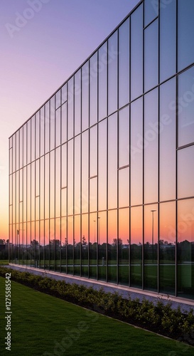 Obraz premium Modern Building Reflecting Sunset Sky with Lush Green Lawn and Bushes