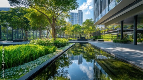 Naklejka premium Modern Building's Tranquil Oasis: A Serene Reflection Pond Amidst Lush Greenery
