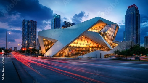 © Adi, Fototapeta premium Modern building with geometric shapes against a city skyline during blue hour
