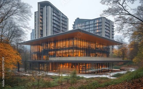 © tahu, Obraz premium Modern building with glass facade and wooden roof, nestled in autumnal park.