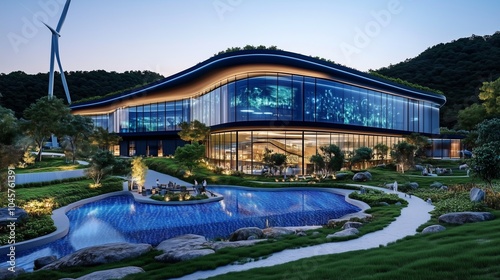 Fototapeta premium Modern building with large windows overlooking a landscaped courtyard with a pool.