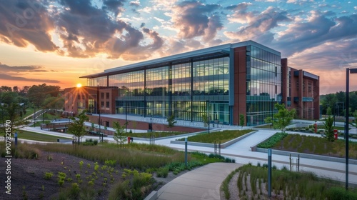 © amorn_m, Obraz premium Modern Building with Sunset Reflection.