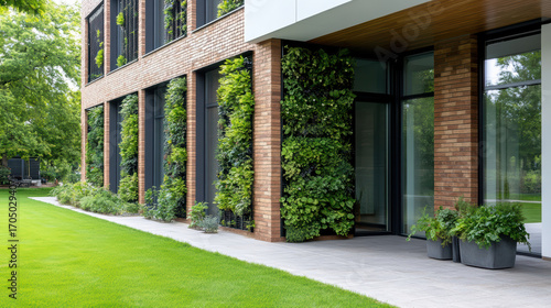 Naklejka premium Modern building with vertical green installations, showcasing blend of nature and architecture