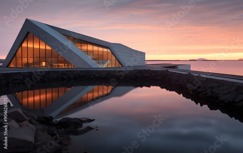 © bharath, Fototapeta premium Modern Building with Water Reflection