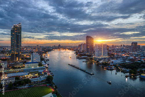 © funfunphoto, Fototapeta premium Modern buildings in the city with water reflection, firework, light show, river ferry boat at twilight time.