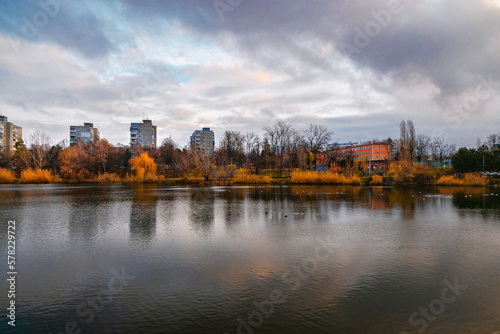 © Vit-Vit, Obraz premium Modern buildings near the lake. City buildings near the lake. Residential buildings near the lake, surrounded by yellow trees. Multi-storey modern residential buildings near the pond in autumn color.