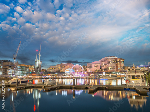 © jovannig, Fototapeta premium Modern buildings of Darling Harbour, Sydney. City night skyline