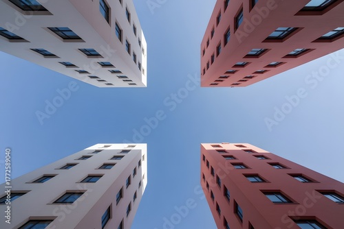 Obraz premium Modern buildings viewed from below against a clear blue sky