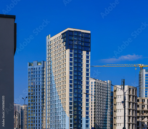 Obraz premium Modern buildings, walls and windows. City view on a sunny day.
