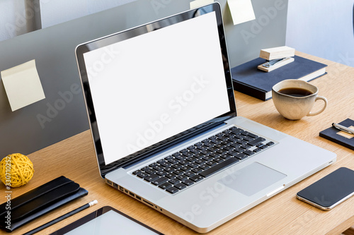 © FollowTheFlow, Fototapeta premium Modern business composition on the wooden desk with mock up laptop screen, tablet, notes, mobile phone, cup of coffee and office supplies in stylish concept of home decor.