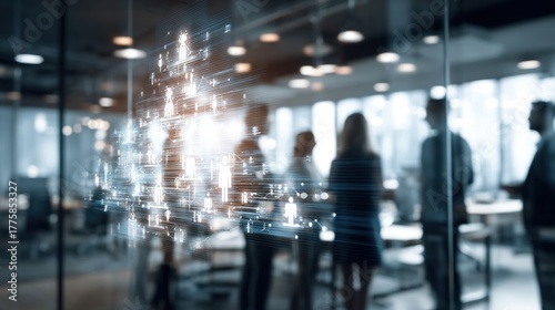 Obraz premium Modern Business Team Collaboration with Futuristic Technology Overlay, Office Environment, Networking and Innovation