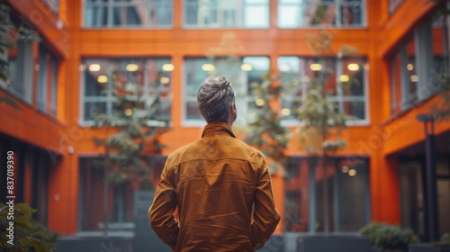 © wiraphat, Fototapeta premium Modern Businessman Admiring Stylish Scandinavian Office Building - Realistic Architectural Scene