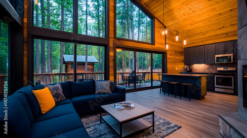 © abid, Naklejka premium Modern cabin interior with expansive windows, wood accents, and open floor plan