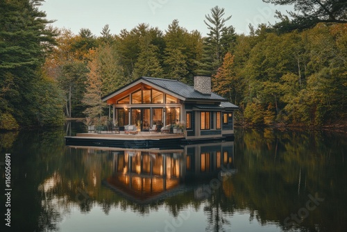 © PD, Fototapeta premium Modern Cabin on the Water Surrounded by Trees During Autumn Sunset in a Serene Location
