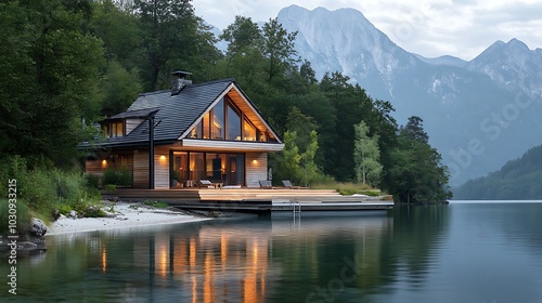 © Helois, Fototapeta premium Modern cabin with large windows on a lake with mountains in the background.