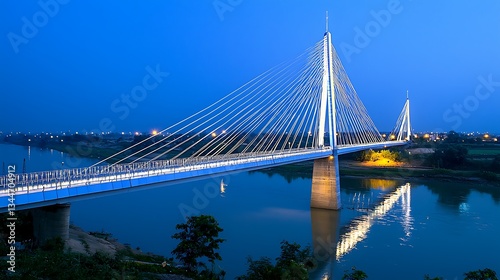 © sarifah, Fototapeta premium Modern cable-stayed bridge spanning a tranquil river at twilight. Illuminated by the soft glow of city lights reflected on the water