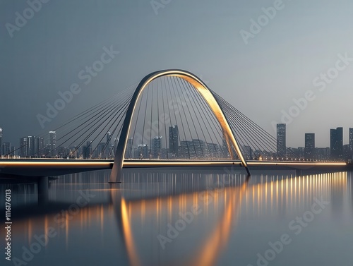 © Creator88, Obraz premium Modern cablestayed bridge with illuminated towers, crossing a river at night, creating a glowing architectural landmark