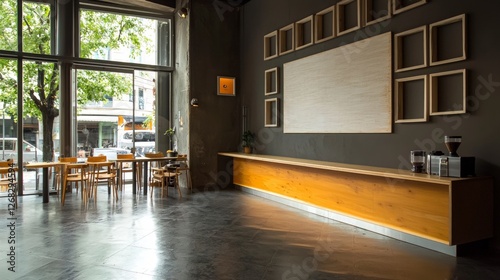 Fototapeta premium Modern Cafe Interior Design Minimalist Wooden Counter Empty Wall Art City...