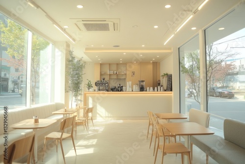 © malayeka, Fototapeta premium Modern cafe interior with light wood furniture and large windows.