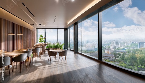 Obraz premium Modern cafe interior with wooden accents and city view. 3D Rendering