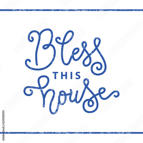 © Rezida, Fototapeta premium Modern calligraphy lettering of Bless this house in blue in mono line style with texture on white background for decoration, postcard, poster, banner, print, design element, interior decoration
