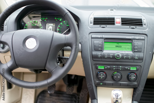 Fototapeta premium Modern car dashboard, steering wheel, radio system and climate control panel