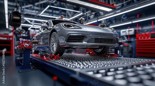 Fototapeta premium Modern car in an auto repair shop, showcasing advanced technology and...