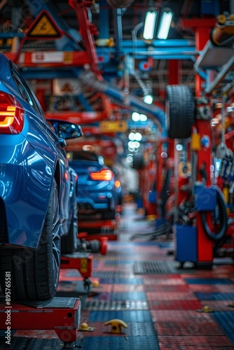 © anwel, Fototapeta premium Modern car on lift in auto service suspension and exhaust focus with text space