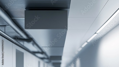 Fototapeta premium Modern ceiling with ventilation and lighting systems in a hallway.