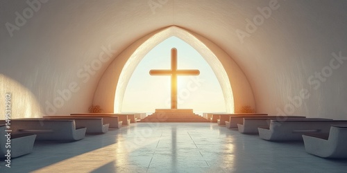 Naklejka premium Modern chapel interior with sunlight illuminating cross at sunrise, inviting...