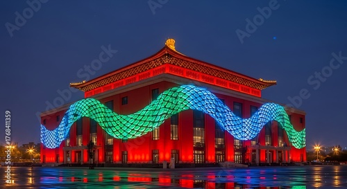 © Subrata, Fototapeta premium Modern Chinese Building Illuminated with Wavy Blue and Green Lights architecture