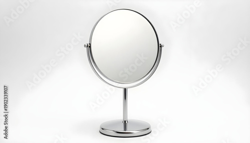 Fototapeta premium Modern chrome tabletop vanity mirror with a round reflective surface on a stand