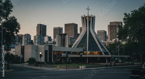 © Matt, Fototapeta premium Modern church with triangular shape and glass facade at city intersection during sunset