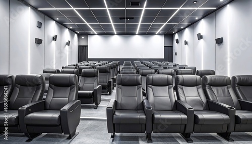 © erna, Fototapeta premium Modern Cinema Interior Featuring Rows of Black Leather Seats and a Projection Screen