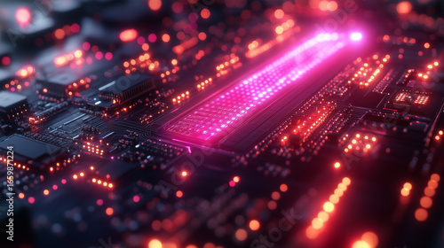 Obraz premium Modern Circuit Board with Glowing Pink and Orange Lights for Futuristic...