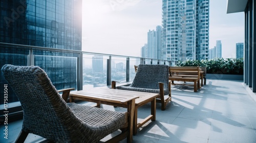 Obraz premium Modern City Balcony with Stylish Outdoor Furniture and Skyline View on a Sunny Day