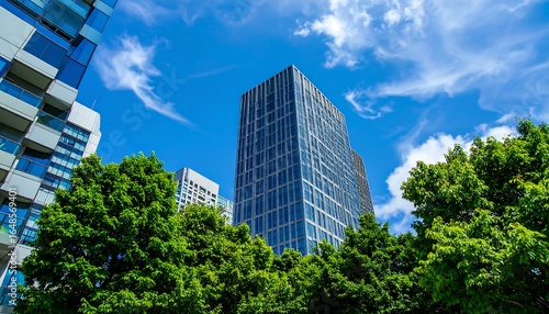 Fototapeta premium Modern city buildings nestled amongst lush greenery against a vibrant blue sky