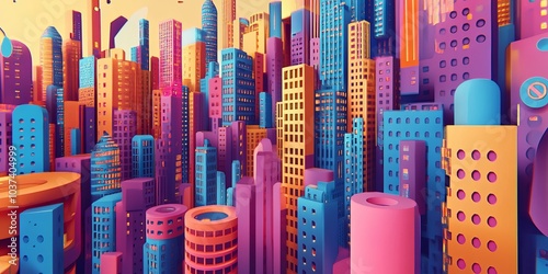 © Nijat, Obraz premium Modern city buildings with abstract shapes, drawn in 3D
