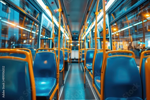 © Anna, Fototapeta premium Modern City Bus Interior, nobody. Spacious and empty interior of a modern city bus with comfortable seating