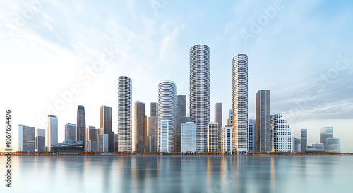 Fototapeta premium Modern city business centre at sunset, office and residential area by the water at gentle pastel colours