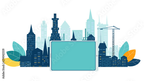 Naklejka premium Modern city, business district surrounded by communication icons. Business concept illustration.