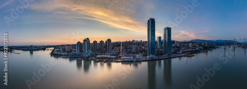 © edb3_16, Fototapeta premium Modern City by river at sunset twilight. New Westminster, Vancouver, BC, Canada.
