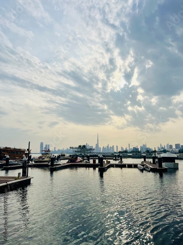 © Oksana, Fototapeta premium Modern city harbor with buildings and skyscrapers silhouette background