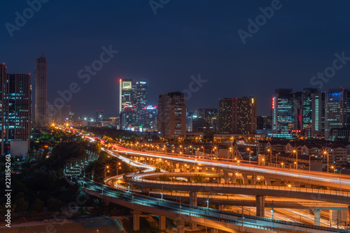© Minase, Naklejka premium Modern city night view with busy traffic in Nanjing