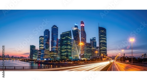 © Raka, Obraz premium Modern City Skyline at Dusk with Traffic Trails.