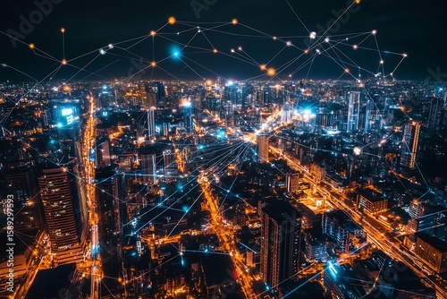 © Puji, Naklejka premium Modern city skyline at night with illuminated buildings and network connection overlay