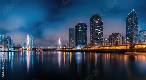 © Artyom, Fototapeta premium Modern city skyline at night with reflection on water