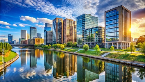 Naklejka premium Modern City Skyline by the River: Architectural Photography of Urban...