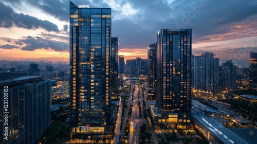 © Monchisa, Fototapeta premium Modern City Skyline During Sunset with Reflection on Glass Buildings