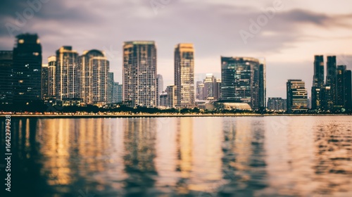 © Dylan, Naklejka premium Modern city skyline glowing at sunset, with towering glass buildings reflecting golden evening light.